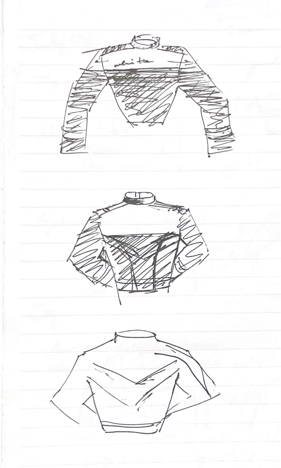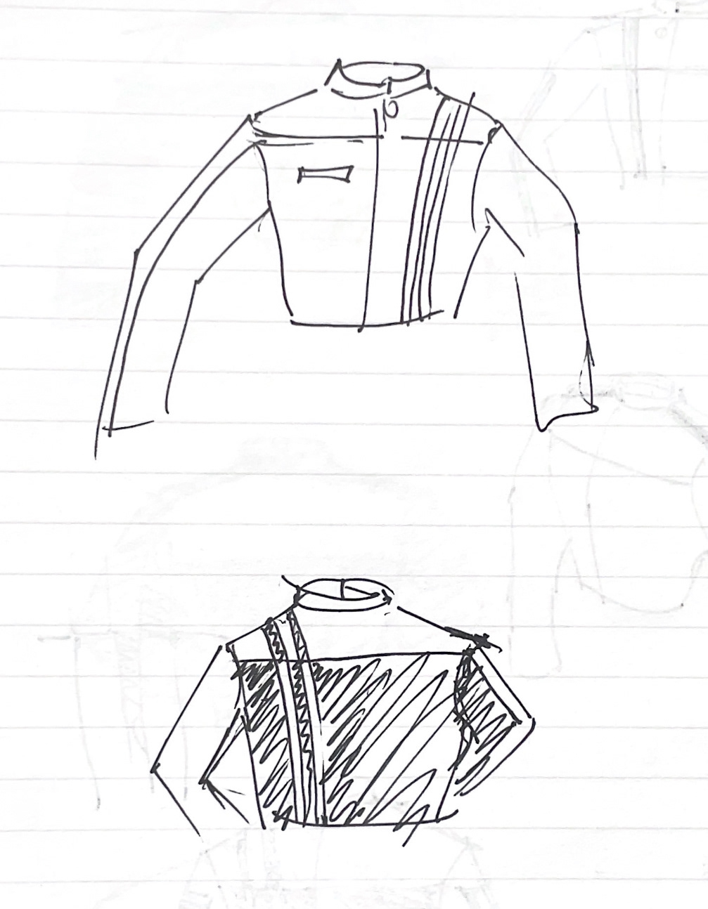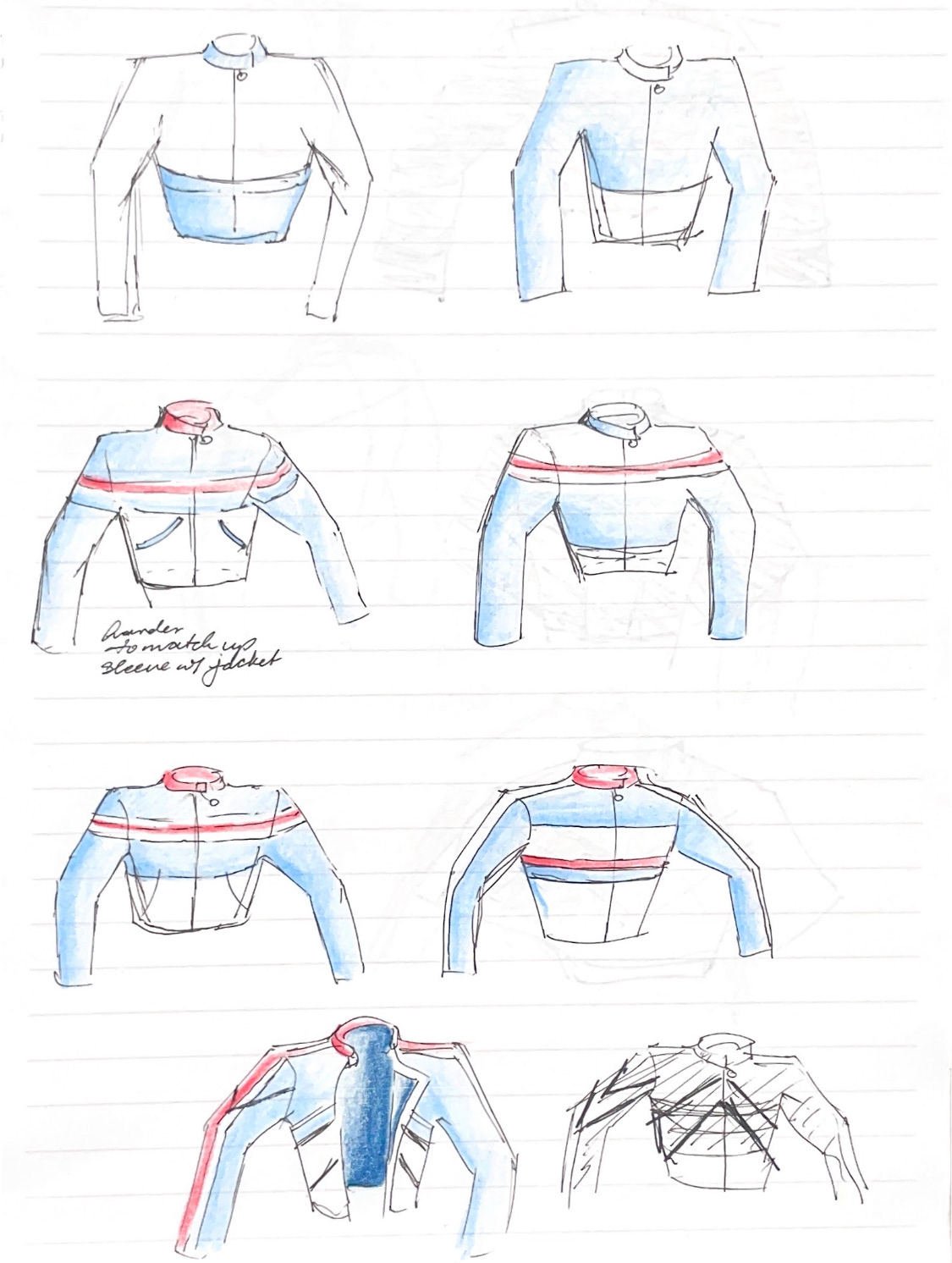 I began some ideation sketches taking inspiration from the horizontal and vertical stripes and blocks of color most prominent in racing suits and biker jackets.